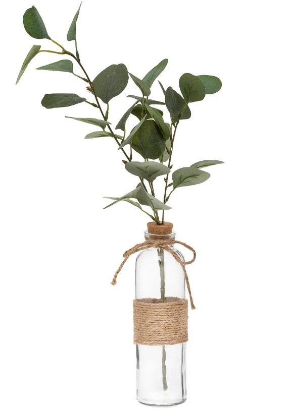 Décoration florale synthétique modèle eucalyptus avec vase transparent – Hauteur environ 45 cm