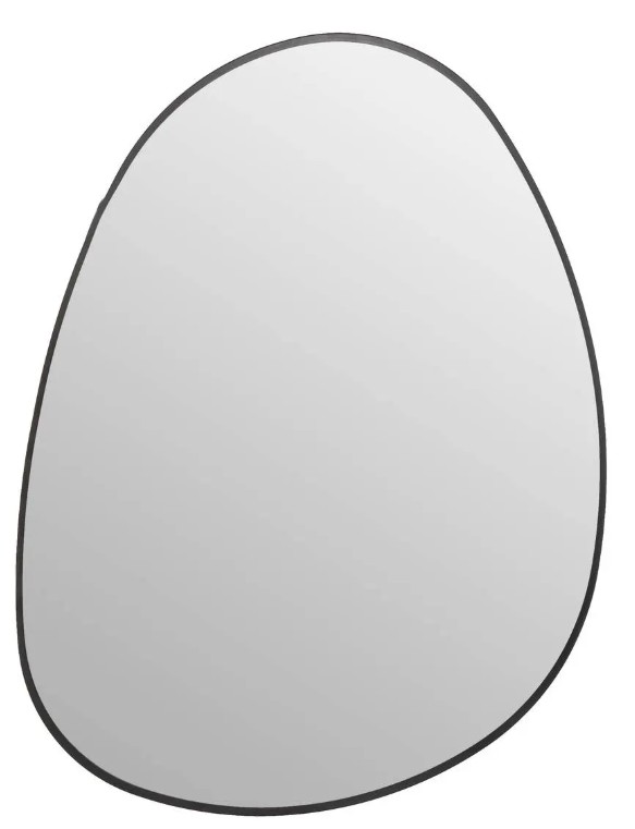 Miroir ovoïde cerclé d’aluminium noir à fixer au mur.
